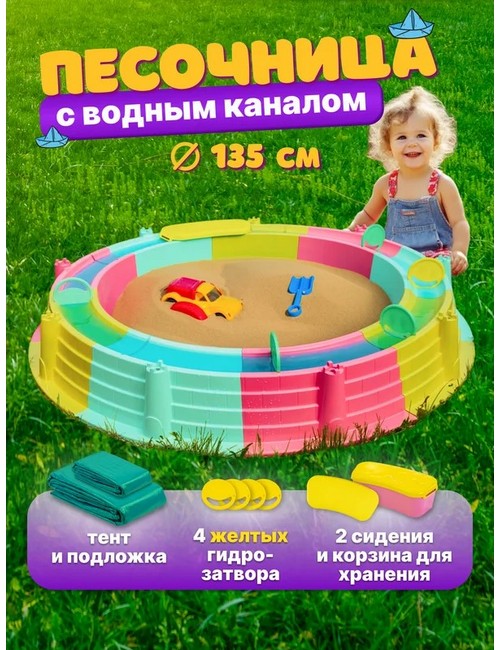 Технические характеристики: Бассейн-песочница детская сборный с чехлом (желтый, розовый, зеленый). Универсальный и многофункциональный игровой комплекс для детей, который легко трансформируется из песочницы в бассейн и даже в сухую игровую зону с шариками. Яркая круглая конструкция с двумя сиденьями, водным каналом и съемным чехлом станет любимым местом для игр на даче, во дворе или в помещении. Наполняется водой для летнего освежения благодаря гидрозатворам и водному каналу. Специальный желоб создает эффект водной речки, добавляя увлекательный элемент в игру. Каждое сиденье выдерживает нагрузку до 100 кг. Легко собирается и разбирается, компактно хранится, легкий вес и удобная транспортировка. Бассейн-песочница детская сборный с чехлом подарит детям часы увлекательных игр, развивая творчество, воображение и физическую активность.
