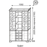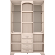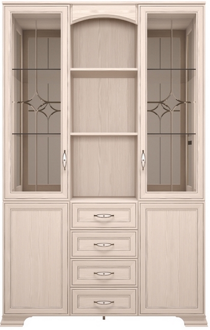 Технические характеристики: Шкаф состоит из трёх секций: центральная и две боковые. Центральная секция оснащена четырьмя выдвижными ящиками и тремя открытыми нишами (2 полки). Боковые секции оснащены отделением-витриной с распашной дверью. Наполнение одной боковой секции состоит из трёх полок (две стеклянных и одна из ЛДСП). Дверные петли с доводчиками. Ящики на шариковых направляющих полного выдвижения. Регулируемые опоры. Верхняя часть шкафа декорирована карнизом. Дополнительная опция 1: комплект зеркал на заднюю стенку стеклянных витрин (оплачивается отдельно). Дополнительная опция 2: комплект стеклянных полок (2 шт.) и стеклянная дверь-витрина в центральную секцию (оплачивается отдельно). Поставляется в разобранном виде.