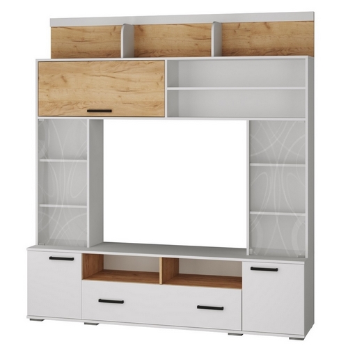 Особенности Центральной секции Оскар-18: Стенка выполнена в трендовом декоре и украшена стеклянными узорчатыми дверцами. Центральная ниша предназначена для размещения телевизора, а под ней - сопутствующей техники. Стеклянные дверцы, украшенные рисунком. Разнообразие зон хранения. Возможность установки в малогабаритном помещении.