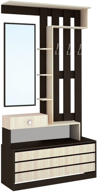 Технические характеристики: Модуль состоит из тумбы, вешалки для верхней одежды, полки для головных уборов, стеллажа и зеркала. Вешалка с тремя крючками. Поставляется в разобранном виде.