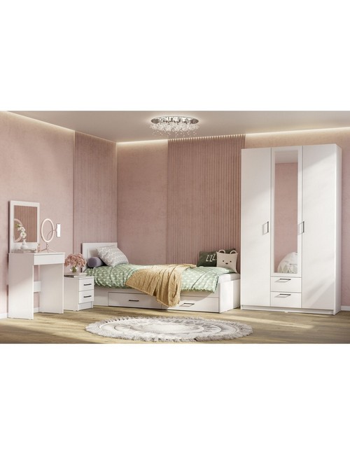 Технические характеристики: Детская Бали комплект 2. Создайте идеальное пространство для вашего ребенка с гарнитуром Бали - гармоничным сочетанием функциональности, комфорта и стиля. Набор включает все необходимое для обустройства уютной и практичной детской комнаты: кровать детская с выдвижными ящиками, прикроватная тумба, трехстворчатый шкаф и туалетный столик с зеркалом. Вместительные выкатные ящики для организации хранения с прочными роликовыми направляющими для плавного открывания. Шкаф со стационарной штангой для удобного хранения одежды. Рекомендуемая нагрузка на спальное место - до 90 кг. Размер спального места 90*200 см, матрас для кровати в комплект не входит. Детская Бали комплект 2 - это готовое решение для создания комфортной и организованной среды, где каждая деталь продумана для удобства и гармоничного развития вашего ребенка.