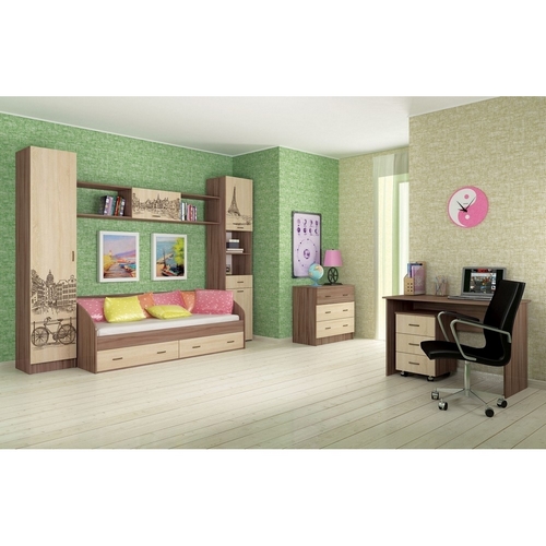 Особенности Детской комнаты Орион: Модульная серия мебели для детской и подростковой спальни. Классические цвета исполнения в сочетании с дизайнерскими изображениями городов мира, нанесенными на фасады методом цветной фотопечати. Кровати комплектуются настилом, матрас приобретается дополнительно.