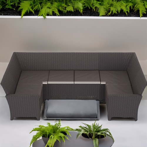 Особенности: Диван П-образный Калифорния (California) 136х264х136 см на 6 мест с подушками на сиденье. Подходит для обустройства веранды, организации отдыха на дачном участке, создания зоны отдыха в саду, оборудования летней террасы или открытых площадок кафе и ресторанов. Дизайн пластика под ротанг придает мебели естественный вид и гармонично сочетается с любым ландшафтом. Пластик не выгорает на солнце, устойчив к осадкам и перепадам температур. Может использоваться как в помещениях, так и на улице. Прочные ножки обеспечивают устойчивость на любой поверхности. Максимальная нагрузка на одно сидячее место - 150 кг. Диван легко собирается и разбирается, что удобно при сезонном использовании. Поставляется в разобранном виде. В комплект входят подушки на сидения.