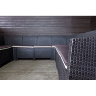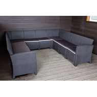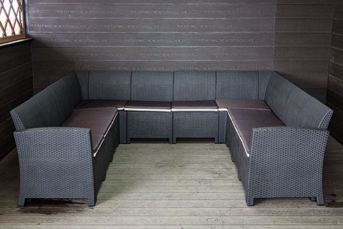 Особенности: Диван П-образный Калифорния (California) 236х264х239 см на 10 мест с подушками на сиденье. Подходит для обустройства веранды, организации отдыха на дачном участке, создания зоны отдыха в саду, оборудования летней террасы или открытых площадок кафе и ресторанов. Дизайн пластика под ротанг придает мебели естественный вид и гармонично сочетается с любым ландшафтом. Пластик не выгорает на солнце, устойчив к осадкам и перепадам температур. Может использоваться как в помещениях, так и на улице. Прочные ножки обеспечивают устойчивость на любой поверхности. Максимальная нагрузка на одно сидячее место - 150 кг. Диван легко собирается и разбирается, что удобно при сезонном использовании. Поставляется в разобранном виде. В комплект входят подушки на сидения.