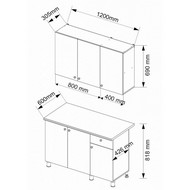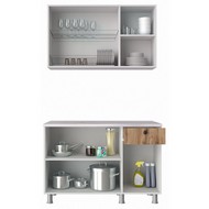 Комплектация: столешница - 120x60x2,8 см, тумба под мойку - 80x42,6x81,8 см, тумба с выдвижным ящиком и 1-ой дверцей - 40x42,6x81,8 см, тумба навесная под сушилку для посуды (сушилка в комплект не входит, без внутренней полки) - 80x30,5x69 см, тумба навесная с одной дверцей - 40x30,5x69 см.