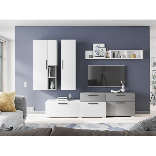 Технические характеристики: Комплект мебели для гостиной в современном стиле. Мебель выполнена из ЛДСП, покрытие матовое. Навесной шкаф-пенал в современном с распашной дверцей. Навесной шкаф-пенал с распашной дверцей и двумя открытыми нишами. Тумба для телевизора оснащена тремя закрытыми отделениями и двумя выдвижными ящиками. ТВ-тумба рассчитана на телевизор диагональю от 50 дюймов (111 см). Цвет может незначительно отличаться от представленного на фотографии.