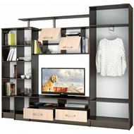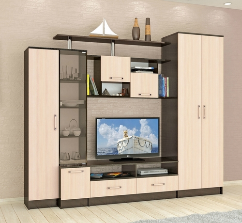 Технические характеристики: Гостиная оснащена: двухдверным шкафом, однодверным шкафом, шкафом для посуды, ТВ-тумбой, открытыми и двумя закрытыми полками. Внутри двухдверного шкафа расположены две полки и выдвижная штанга для вешалок. Внутри однодверного шкафа - четыре полки. За стеклянной дверью шкафа для посуды расположены три полки. ТВ-тумба с двумя выдвижными ящиками. Размеры ниши под телевизор: ширина - 115 см, высота - 75 см. Поставляется в разобранном виде.