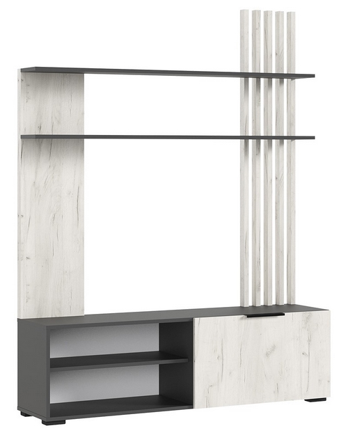Особенности: Гостиная Роджина (дуб крафт белый, графит) — это изысканный элемент мебели. Секция предназначена для установки телевизора и оснащена полками. Металлические ручки. Пластиковые опоры. Регулируемые ножки.