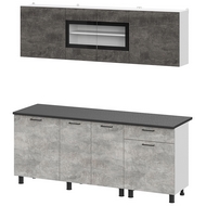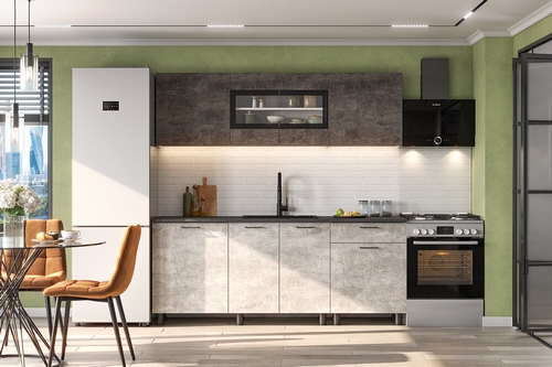 Особенности: Готовая кухня КГ 9 - это стильное и функциональное решение для вашей кухни. Интересное исполнение темного и светлого оттенка цемента в сочетании с черной столешницей придает кухне особенный шарм. Кухонный гарнитур состоит из столешницы, настенных и напольных модулей, которые обеспечивают удобное хранение посуды, продуктов и других кухонных принадлежностей. Столешница толщиной 26 мм выполнена в черном цвете. Верхний и нижний модули разделены на 3 секции с полками и дверцами. Центральные секции обоих модулей оснащены двустврочатыми дверцами, у верхнего они оформлены стекляной вставкой обрамленной черной декоративной рамкой. На фасадах навесных шкафов отсутсвуют фурнитура и открываются за нижний торец. На фасадах напольных шкафов установлены лаконичные черные ручки-скобы. Конструкция секции под мойку оснащена открытой задней стенкой для монтажа необходимых коммуникаций. Ящики с шариковыми направляющими полного выдвижения. Гарнитур изготовлен из ЛДСП, этот материал прост в уходе, обладает высокой устойчивостью к механическим воздействиям. Регулируемые опоры позволяют надежно установить напольный модуль на любой поверхности. Смеситель и мойка в комплектацию не входят, приобретаются отдельно. Реальный цвет товара может отличаться от цвета товара на фотографии.