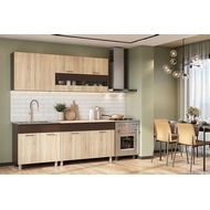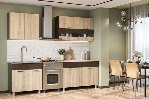 Особенности: Готовая кухня Босфор выполнена в красивом контрастном сочетании цветов дуб венге и дуб сонома, что позволяет ей гармонично вписаться в любой интерьер. Кухонный гарнитур состоит из двух навесных шкафов шириной 80 см и 120 см и также двух напольных модулей шириной 80 см и 120 см соответственно. Верхний шкаф 80 см оснащен двумя полками и двустворчатым фасадом, 120 см - с двумя горизонтальными откидными фасадами и 4-мя полками. Напольный шкаф 80 см без столешницы рассчитан под мойку и его открытая задняя стенка удобна для монтажа необходимых коммуникаций. Напольный шкаф 120 см со столешницей толщиной 26 мм и выдвижным ящиком на шариковых направляющих подойдет для организации рабочей зоны на кухне. На фасадах навесных шкафов отсутствуют фурнитура (кроме верхней горизонтальной створки) и открываются за нижний торец. На фасадах напольных шкафов установлены стильные ручки-скобы. Гарнитур изготовлен из ЛДСП, этот материал прост в уходе, обладает высокой устойчивостью к механическим воздействиям. Регулируемые опоры позволяют надежно установить напольный модуль на любой поверхности. Смеситель и мойка в комплектацию не входят, приобретаются отдельно. Реальный цвет товара может отличаться от цвета товара на фотографии.
