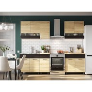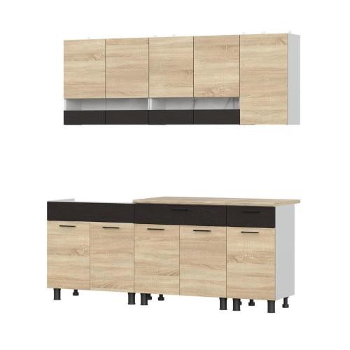 Особенности: Верхние фасады открываются за нижний торец, за счёт приподнятых относительно боковин нижних вязок. Столешница Дуб Сонома 26 мм (модуль под мойку столешницей не комплектуется). Стеклостворка - ЛДСП дуб сонома / дуб венге плюс прозрачное стекло 4 мм. Ручки на нижних модулях Чёрный глянец. Опоры регулируемые декоративные Чёрные — 6 шт., и под цоколь — 6 шт. Петли створок без доводчиков. Роликовые направляющие выдвижных ящиков.
