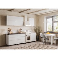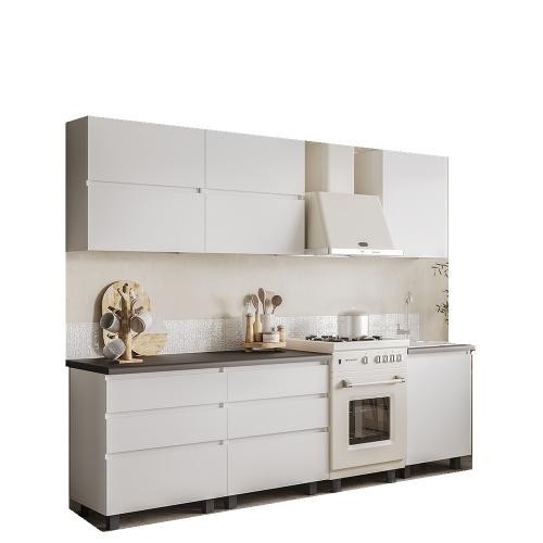 Особенности: Комплектуется цельной столешницей Черный мрамор толщиной 38 ммю. Отсутствие лицевой фурнитуры. Ящик на роликовых направляющих. Нижние модули с интегрированными ручками. Регулирующиеся опоры. Длина столешницы составляет 2 метра.