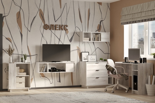 Особенности: Модульная конструкция Флекс позволяет легко комбинировать элементы мебели для кабинета. Кабинет содержит открытые и закрытые полки с дверцами и без, а также удобные выдвижные ящики. Ящики комода оснащены шариковыми направляющими полного выдвижения и лаконичными торцевыми ручками. Бортики по краям столешницы предотвращают падение предметов. Напольные модули с притопленным цоколем позволяют легко размещать мебель в комнатах с плинтусами. Возможна правосторонняя и левосторонняя сборка модулей. Комбинация открытых и закрытых систем хранения придает кабинету уютный вид.