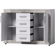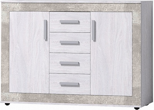 Технические характеристики: Комод оснащён 2 отделениями с распашной дверью и 4 выдвижными ящиками. В каждом отделении с распашной дверью расположено по 1 полке. Выдвижные ящики на шариковых направляющих. Размеры выдвижного ящика: ширина - 35 см, глубина - 35 см, высота - 14 см. Максимальная нагрузка на 1 выдвижной ящик - 10 кг. Актуальный и современный декор фасадов "под бетон". Ручки выполнены из массива дерева и окрашены в серебристый цвет. Регулируемые опоры позволяют компенсировать незначительные неровности пола. Поставляется в разобранном виде.