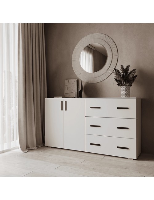 Технические характеристики: Комод Бостон 2 (белый) вместительный комод, который создаст порядок в любом помещении. Комод выполнен из прочных и износостойких материалов. Внутреннее наполнение комода включает в себя три больших выдвижных ящика и удобные полки. Дверцы комода распашные.