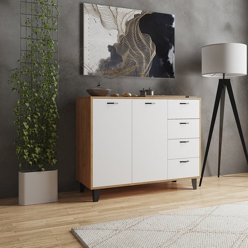 Особенности: Вместительный комод Катрин-12 поможет организовать хранение в вашем доме и будет отлично смотреться в любом интерьере. Каркас с текстурой натурального дерева дуб крафт золотой гармонично дополнен фасадами белого цвета с контрастными ручками. Четыре выдвижных ящика на шариковых направляющих и полки за распашными фасадами обеспечат удобное хранение вещей. Ножки комода не только создают ощущение легкости и простора, но и обеспечивают удобство при уборке помещения. Комод Катрин-12 изготовлен из ЛДСП, этот материал прост в уходе, обладает высокой устойчивостью к механическим воздействиям. Реальный цвет товара может отличаться от цвета товара на фотографии.