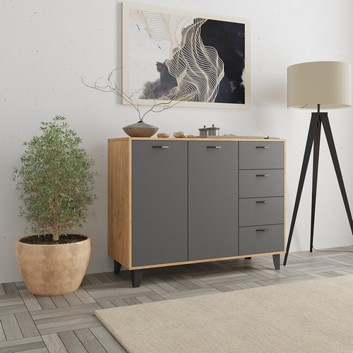 Особенности: Вместительный комод Катрин-12 поможет организовать хранение в вашем доме и будет отлично смотреться в любом интерьере. Каркас с текстурой натурального дерева дуб крафт золотой гармонично дополнен фасадами цвета графит с черными ручками. Четыре выдвижных ящика на шариковых направляющих и полки за распашными фасадами обеспечат удобное хранение вещей. Ножки комода не только создают ощущение легкости и простора, но и обеспечивают удобство при уборке помещения. Комод Катрин-12 изготовлен из ЛДСП, этот материал прост в уходе, обладает высокой устойчивостью к механическим воздействиям. Реальный цвет товара может отличаться от цвета товара на фотографии.