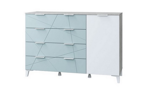 Дополнительно: Комбинированный комод Лагуна актуален как в гостиной в качестве тумбы под ТВ и места под сопутствующую технику, книги, коробки с вещами, так и в спальне. Одежду в сложенном виде и белье можно разместить в выдвижных ящиках, оснащенных шариковыми направляющими. Закрытые полки пригодятся для хранения других личных вещей. Белые тонкие опоры. Шариковые направляющие полного, плавного и бесшумного выдвижения. Количество ящиков - 4. Направляющие - Шариковые. Ножки - Да. Ящики - Да. Дверцы - Да. Полки - Да.