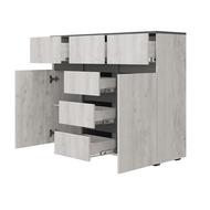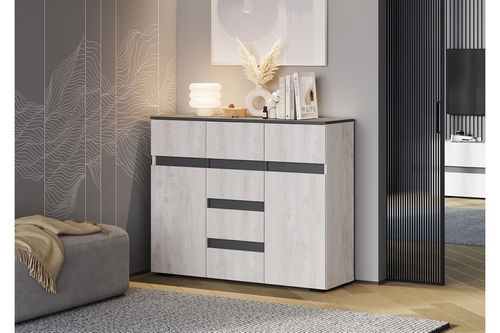 Особенности: Благодаря своей универсальной конструкции и вместительности комод Мрия КМ-15 станет стильным и функциональным решением для интерьера любой комнаты: спальни, гостиной, прихожей, детской или кабинета. Комбинированный комод Мрия КМ-15 выполнен в цвете графит в сочетании со светлым оттенком бетон пайн и идеально впишется в различные стили оформления. Шесть вместительных ящика и две полки за распашными дверьми позволят организовать место хранения белья и одежды, аксессуаров и других бытовых предметов. Створки оснащены накладными петлями, а ящики - шариковыми направляющими. Комод изготовлен из высококачественного ЛДСП, что гарантирует долговечность и устойчивость к механическим повреждениям и выдерживает максимальную нагрузку на полки в 10 кг, а на выдвижной ящик — 5 кг. Реальный цвет товара может отличаться от цвета товара на фотографии.