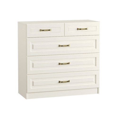 Особенности: Комод Ливерпуль 10.103.01 изготовлен из ЛДСП и МДФ с рисунком имитирующим крашеный массив. Комод оснащён пятью вместительными ящиками. Фрезерованные фасады придают комоду изысканный и утонченный вид. Ящики оснащены шариковыми направляющими. Ручки на фасадах выполнены из металла в цвете состаренной бронзы. Максимальная нагрузка на столешницу - 15 кг, на ящик - 5 кг. Можно компоновать с другими модулями из серии мебели Ливерпуль. Реальный цвет товара может отличаться от цвета товара на фотографии. Поставляется в разобранном виде.