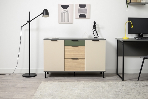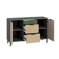 Особенности: Комод Марвэл 16.234.02 выполнен в стильном сочетании темно-серого корпуса с яркими фасадами в цвете сатин, плэйн и дымчатый зеленый. Комод состоит из трех выдвижных ящиков и двух боковых отсеков с распашными дверцами и полками. Ящики оснащены шариковыми направляющими. Металлические опоры с регулировкой. Фасады оснащены торцевыми металлическими ручками. Можно компоновать с другими модулями из серии мебели Марвел. Реальный цвет товара может отличаться от цвета товара на фотографии. Поставляется в разобранном виде.