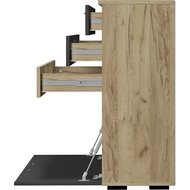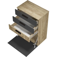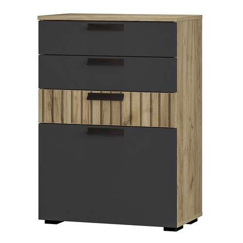 Особенности: Комод Мишель 1 КМ-12 представляет собой стильное и функциональное решение для хранения одежды, белья и других вещей. Высокий и вместительный комод с тремя ящиками и нижней полкой с откидным фасадом. Корпус выполнен в цвете крафт, а фасады двух ящиков и нижней полки в глубоком оттенке графит, а один из ящиков украшен фотопечатью, имитирующей деревянные рейки. Ящики оснащены шариковыми направляющими, обеспечивающими плавное и бесшумное открывание. Также на фасадах ящиков установлены стильные накладные ручки из АБС-пластика. Небольшие опоры без ножек обеспечивают хорошую устойчивость комоду. Реальный цвет товара может отличаться от цвета товара на фотографии. Максимальная нагрузка на полку 10 кг. Максимальная нагрузка на ящик 5 кг