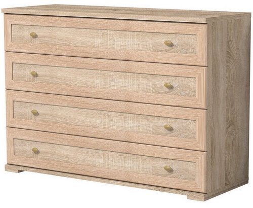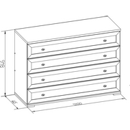 Технические характеристики: Комод с четырьмя ящиками. Рамочные фасады с раскладкой из профиля МДФ. Выдвижные ящики на шариковых направляющих. Ящики выдерживают нагрузку до 20 кг. Ящики глубиной 14 см.