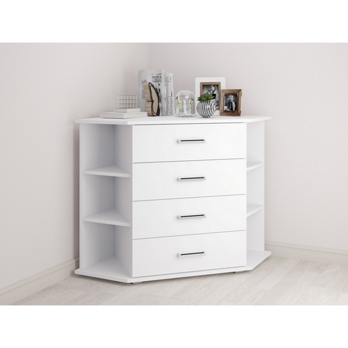 Особенности Комода углового Катрин 7: Угловой комод с открытыми полками и выдвижными ящиками. Выдвижные ящики установлены на роликовых направляющих. Максимальная распределенная нагрузка для выдвижных ящиков на дно 8-10 кг.
