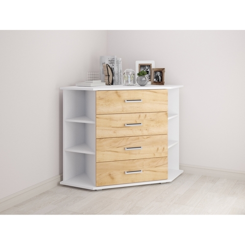 Особенности Комода углового Катрин 7: Угловой комод с открытыми полками и выдвижными ящиками. Выдвижные ящики установлены на роликовых направляющих. Максимальная распределенная нагрузка для выдвижных ящиков на дно 8-10 кг.