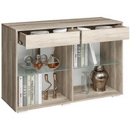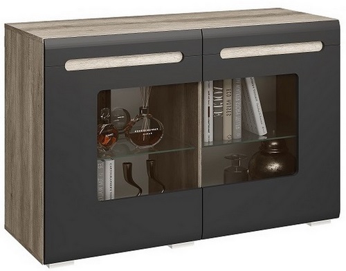 Технические характеристики: Комод с комбинированными фасадами и стеклянными вставками. Оснащен двумя выдвижными ящиками. Матовые фасады со стеклом. Ручки с декором под дубовый спил. Стеклянные полки.