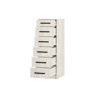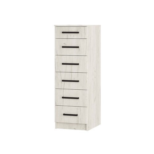 Особенности: Функциональная модель комода высокого Фиеста (дуб крафт белый) отлично впишется в любую комнату от коридора до спальни. Материал каркаса: ЛДСП. Материал фасада: ЛДСП. Ручки: Накладные, пластик, 192 мм. Опоры: Подпятник, пластик. Количество ящиков: 6. Направляющие ящиков: Роликовые. Максимальная нагрузка на ящик: 5 кг.