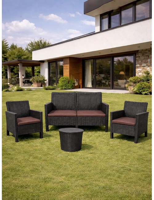Комплект 2 садовых кресла, двухместный диван и столик под ротанг СадКо (темно-серый с коричневыми подушками)