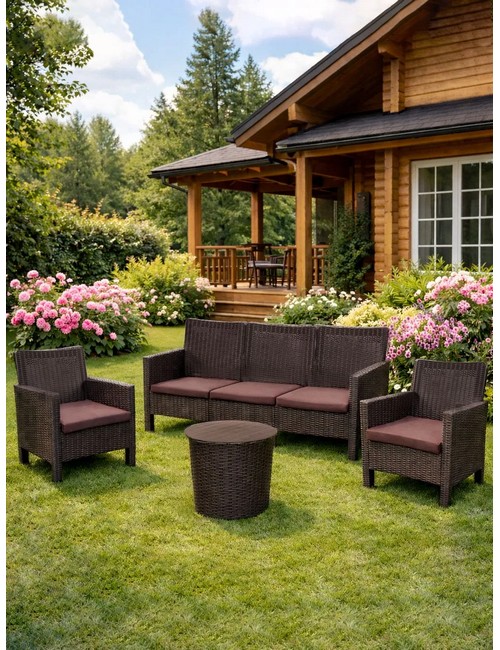 Комплект 2 садовых кресла, трехместный диван и столик под ротанг СадКо (темно-коричневый с коричневыми подушками)