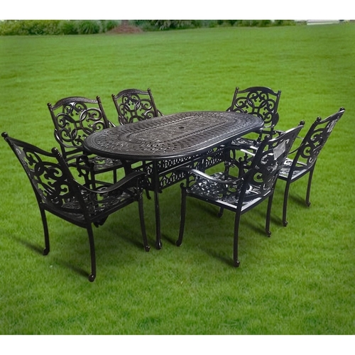 Технические характеристики: Комплект мебели из литого алюминия состоит из овального стола Брайдед и 6 кресел Джунген. В центре столешницы отверстие для установки зонта. Литой алюминий не подвержен коррозии. Устойчивость к перепадам температур и повышенной влажности.