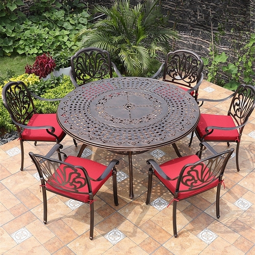 Технические характеристики: Комплект мебели из литого алюминия состоит из круглого стола и шести кресел с подлокотниками. Стол с круглой столешницей, декорированной орнаментом. В центре столешницы отверстие для установки зонта. Комплект не требует специального ухода. Устойчив к воздействию влаги, солнечных лучей и низких температур. Не подвержен образованию коррозии. Каждая упаковка рассчитана на 2 кресла. Подушки не входят в комплект и приобретаются отдельно.