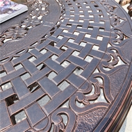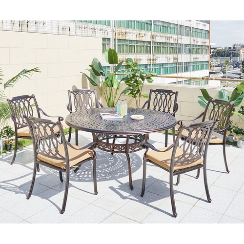 Технические характеристики: Комплект мебели из литого алюминия состоит из круглого стола и шести кресел с подлокотниками. Стол с круглой столешницей, декорированной орнаментом. В центре столешницы отверстие для установки зонта. Комплект не требует специального ухода. Устойчив к воздействию влаги, солнечных лучей и низких температур. Не подвержен образованию коррозии. Каждая упаковка рассчитана на 2 кресла. Подушки не входят в комплект и приобретаются отдельно.