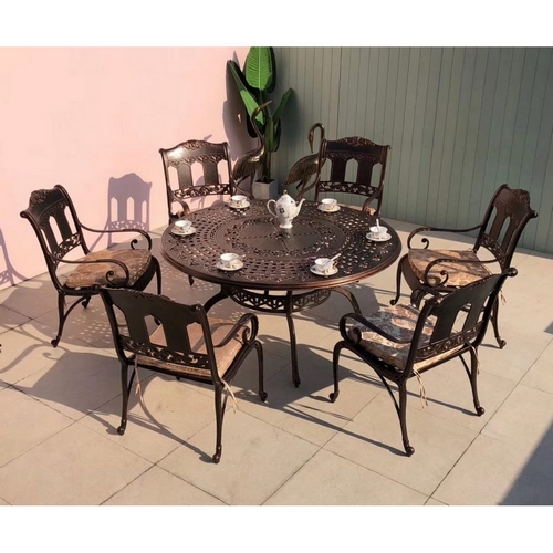 Технические характеристики: Комплект мебели из литого алюминия состоит из круглого стола и шести кресел с подлокотниками. Стол с круглой столешницей, декорированной орнаментом. В центре столешницы отверстие для установки зонта. Комплект не требует специального ухода. Устойчив к воздействию влаги, солнечных лучей и низких температур. Не подвержен образованию коррозии. Подушки не входят в комплект и приобретаются отдельно.