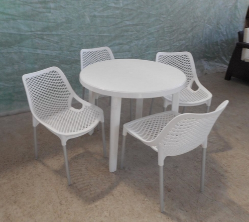 Технические характеристики: комплект изготовлен из прочного, не токсичного пластика, не подвержен влиянию неблагоприятных погодных условий, устойчив к перепадам температуры и не боится повышенной влажности, подходит для использования на участке загородного дома или дачи, отверстие для установки зонта с заглушкой в центре столешницы, кресла штабелируются.
