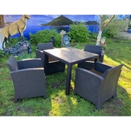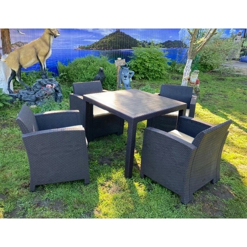Технические характеристики: Комплект состоит из четырех кресел и обеденного квадратного стола. Прочный всепогодный плетеный пластик - имитация ротанга. Долговечная неметаллическая рама не гниет, не ржавеет. Поставляется в комплекте с мягкими подушками на сиденья. Может использоваться как в помещениях, так и на улице. Комплект не выгорает на солнце, устойчив к осадкам и перепадам температур. Подходит как для частного, так и для коммерческого применения (кафе, рестораны, лаунж-зоны и пр.). Поставляется в разобранном виде. Цвет может отличаться от представленного на фотографии.