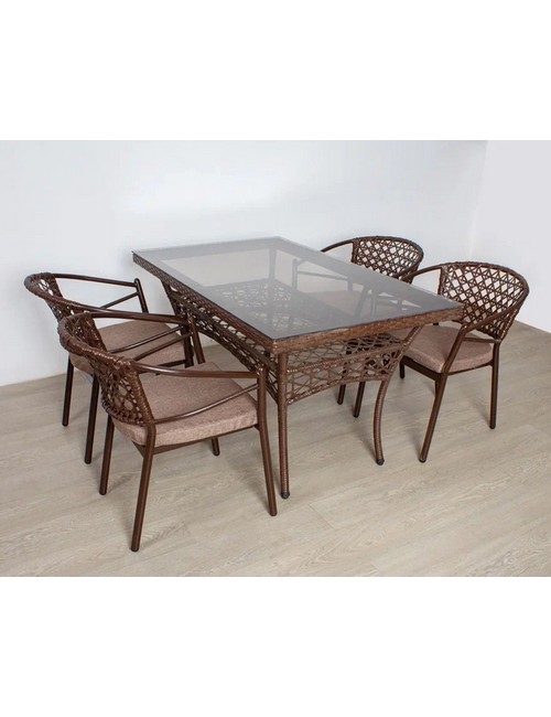 Технические зарактеристики: Комплект садовой мебели со столом Адлер длиной 1,4 метра и четырьмя стульями Латте с подушкой подходит для использования на открытых верандах и террасах. Мебель не выгорает на солнце, устойчива к любым видам осадков и перепадам температуры. Штабелируемые стулья. Не требует специального ухода.