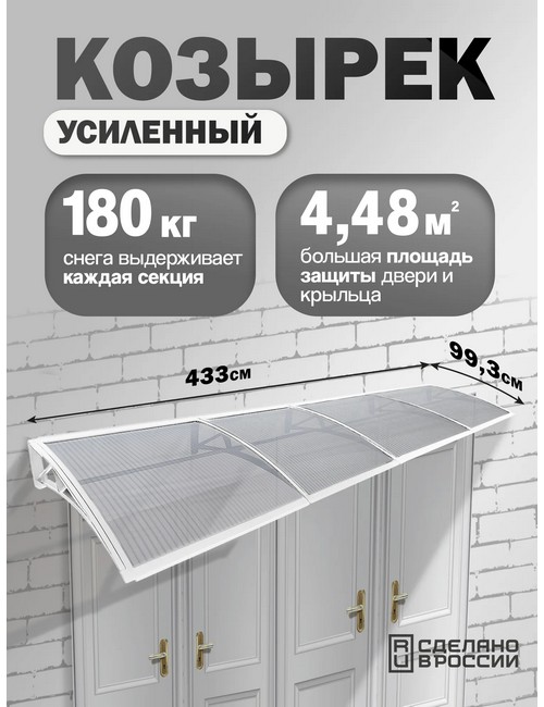 Технические характеристики: Козырек-навес защитный усиленный четверной (белый, прозрачный). Надежный и стильный козырек из поликарбоната для защиты входной двери, крыльца и порога от дождя, снега и солнечных лучей. Модель с пластиковым каркасом отличается высокой прочностью, простым монтажом и способностью выдерживать значительные нагрузки. Поликарбонат толщиной 6 мм - ударопрочный, легкий, устойчивый к градам и механическим повреждениям. Не желтеет со временем, хорошо пропускает свет, но защищает от ультрафиолета. Пластиковый каркас - легкий, устойчивый к коррозии, не требует покраски. Выдерживает нагрузку до 180 кг на секцию - устойчив к снеговым нагрузкам и воздействию внешней среды. Конструкция разработана для быстрой и легкой установки, все крепления в комплекте. Козырек-навес защитный усиленный четверной обеспечит надежную защиту входной зоны и придаст фасаду завершенный, современный вид.
