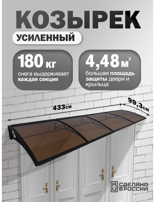 Технические характеристики: Козырек-навес защитный усиленный четверной (черный, темный). Надежный и стильный козырек из поликарбоната для защиты входной двери, крыльца и порога от дождя, снега и солнечных лучей. Модель с пластиковым каркасом отличается высокой прочностью, простым монтажом и способностью выдерживать значительные нагрузки. Поликарбонат толщиной 6 мм - ударопрочный, легкий, устойчивый к градам и механическим повреждениям. Не желтеет со временем, хорошо пропускает свет, но защищает от ультрафиолета. Пластиковый каркас - легкий, устойчивый к коррозии, не требует покраски. Выдерживает нагрузку до 180 кг на секцию - устойчив к снеговым нагрузкам и воздействию внешней среды. Конструкция разработана для быстрой и легкой установки, все крепления в комплекте. Козырек-навес защитный усиленный четверной обеспечит надежную защиту входной зоны и придаст фасаду завершенный, современный вид.