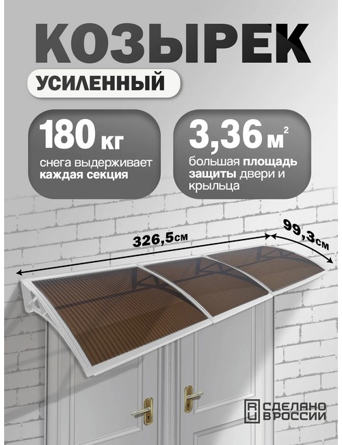 Технические характеристики: Козырек-навес защитный усиленный тройной (белый, темный). Надежный и стильный козырек из поликарбоната для защиты входной двери, крыльца и порога от дождя, снега и солнечных лучей. Модель с пластиковым каркасом отличается высокой прочностью, простым монтажом и способностью выдерживать значительные нагрузки. Поликарбонат толщиной 6 мм - ударопрочный, легкий, устойчивый к градам и механическим повреждениям. Не желтеет со временем, хорошо пропускает свет, но защищает от ультрафиолета. Пластиковый каркас - легкий, устойчивый к коррозии, не требует покраски. Выдерживает нагрузку до 180 кг на секцию - устойчив к снеговым нагрузкам и воздействию внешней среды. Конструкция разработана для быстрой и легкой установки, все крепления в комплекте. Козырек-навес защитный усиленный тройной обеспечит надежную защиту входной зоны и придаст фасаду завершенный, современный вид.