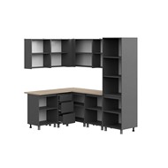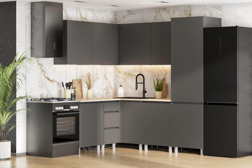 Особенности: Корпус ЛДСП, графит серый. Фасад ЛДСП, графит серый. Скрытая фурнитура. Направляющие ящиков: Роликовые. Опоры пластиковые регулируемые, 10 см. Столешница в комплект не входит.