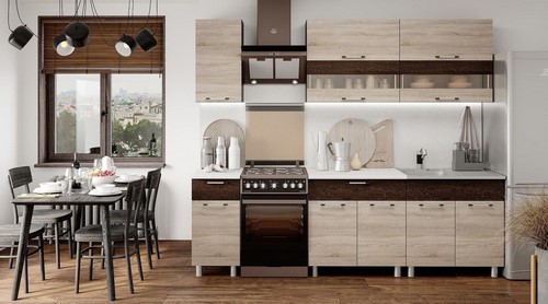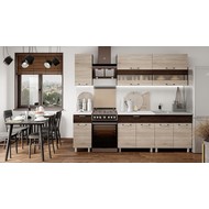 Особенности: Вместительные напольные шкафы с глухими дверцами. Подвесные шкафчики декорированны матовым стеклом. В комплект входят верх: шкафы 4В1, 8В3, 8В3, низ: 4Р5 рабочий на 400 с 1 выдвижным ящиком и 1 распашной своркой, 8Р5рабочий на 800, с 1 выдвижным ящиком и 2 распашными створками, 8М2 мойка на 800, фальш панель и 2 распашные створки.