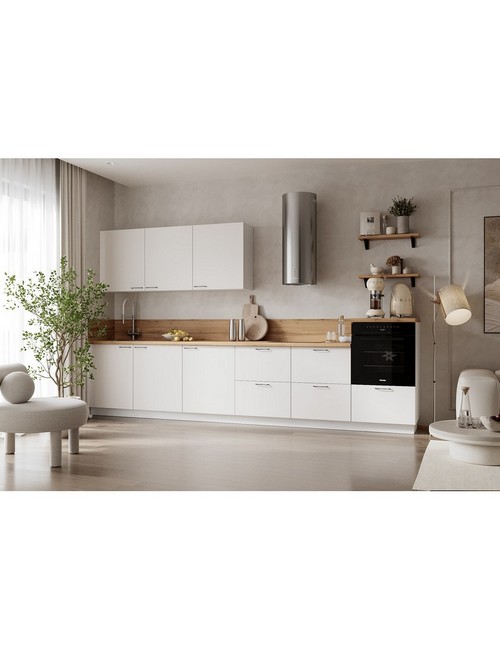 Технические характеристики: Кухонный гарнитур 3600 вариант 5 Лизет (белый софт матовый). Роскошный кухонный гарнитур с безупречными линиями и гармоничными пропорциями. Благородная палитра оттенков, выразительная текстура дерева и сдержанная эстетика, создающая атмосферу уюта и порядка. Направляющие Firmax с повышенным запасом прочности - свыше 60 000 циклов. Усиленные механизмы, выдерживающие нагрузку более 30 кг. Бесшумная и плавная работа всех движущихся элементов. Встроенная система Push to Open для скрытых ящиков, усиленное дно внутренних модулей для повышенной надежности. Высокий модуль под духовой шкаф для современного зонирования и регулируемые опоры для идеальной устойчивости. Цельная столешница без видимых стыков для простоты ухода, сменные металлические ручки, не требующие пересверливания. В кухонном гарнитуре 3600 вариант 5 коллекции Лизет каждая деталь, от премиальной фурнитуры до бесшовных поверхностей, создает кухню, которая станет не только функциональным пространством, но и источником вдохновения для всей семьи.