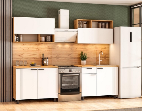 Особенности: Кухонный гарнитур Монако 2 м выполнен в стильном сочетании цветовой гаммы дуб золотой, белый матовый, дуб вотан. Удобные шкафы с полками, ящиком для мелочей и со столешницей создают эргономичную рабочую зону на кухне. Уникальная особенность гарнитура – верхние шкафы можно переворачивать и устанавливать как с открытыми нишами сверху, так и наоборот, обеспечивая максимальную гибкость планировки. Гарнитур изготовлен из высококачественных материалов ЛДСП и МДФ. Двери оснащены накладными петлями без доводчиков и стильными пластиковыми ручками, ящик - роликовыми направляющими. Регулируемые опоры обеспечат устойчивость гарнитура на любом полу. Максимальная нагрузка на ящик – 10 кг, на полку – 5 кг. Мойку и стеновую панель необходимо приобрести отдельно.