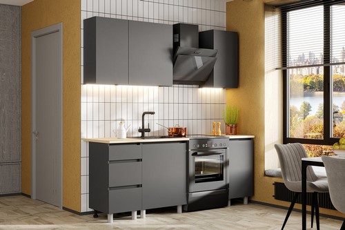 Особенности: Модульная кухня Денвер 1,4 м (графит) - отличное решение для тех, кто ценит комфорт и качество. Скрытая фурнитура. Направляющие роликовые. Столешницы 2 шт. - ДСП постформинг 100 см и 40 см в цвете Дуб Сонома под врезную мойку. Опоры пластиковые регулируемые 10 см. При сборке нижний шкаф используется как шкаф под мойку.