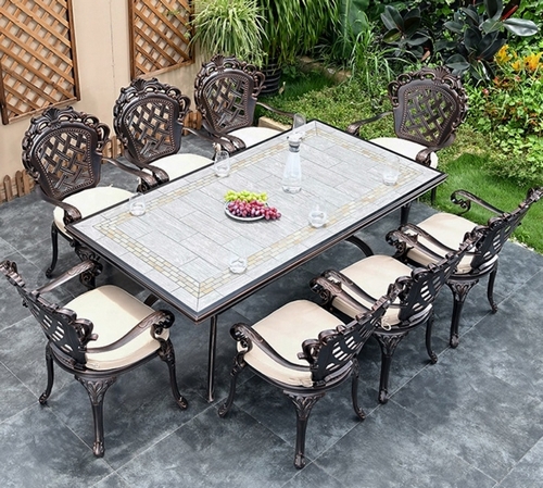 Технические характеристики: комплект состоит из стола и восьми кресел, материал изготовления - сплав алюминия, устойчивость к перепадам температур и повышенной влажности, стол и стулья украшены изящным узором, не требует особого ухода, поставляется без подушек.
