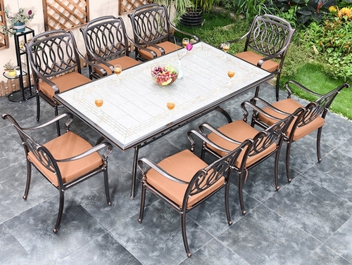 Технические характеристики: комплект состоит из стола и восьми кресел, материал изготовления - сплав алюминия, устойчивость к перепадам температур и повышенной влажности, стол и стулья украшены изящным узором, не требует особого ухода, поставляется без подушек.